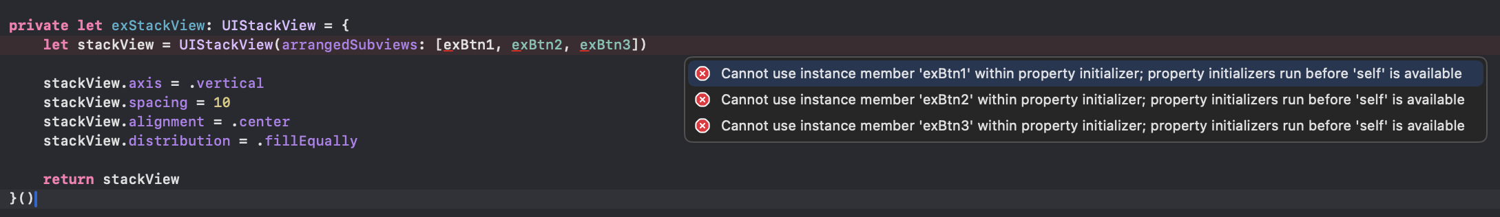 Troubleshooting - Cannot use instance member 'exBtn1' within property initializer; property initializers run before 'self' is available 해결