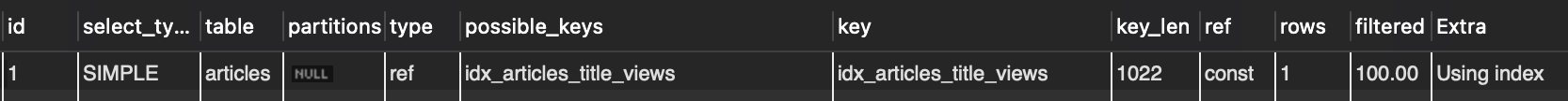 EXPLAIN SELECT article_id, title, views FROM articles WHERE title = 'SQL 인덱스 완벽 정리';