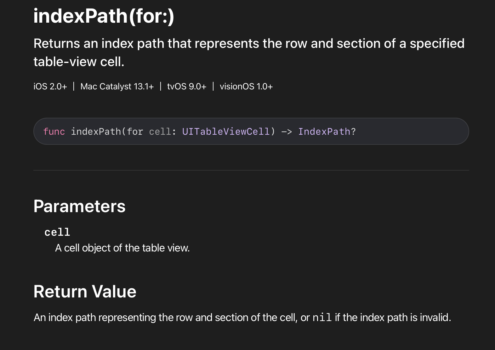 특정 UITableViewCell 객체의 IndexPath를 얻기 위해선 UITableView 객체의 indexPath(for:) 메서드를 통해 처리 가능함.