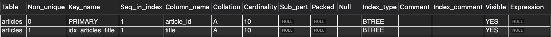 Key_name: 인덱스 이름Column_name: 해당 인덱스가 어떤 컬럼을 기반으로 만들어졌는지를 표시함.Non_unique:1: 중복 값을 허용하는 인덱스0: 중복 값을 허용하지 않는 고유 인덱스UNIQUE또는PRIMARYKEY라는 의미임.