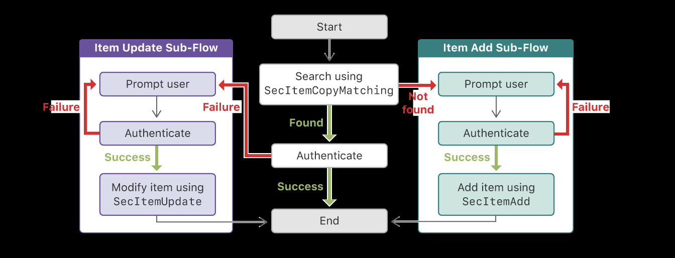 KeyChain Service API를 통해 암호화된 데이터에 쉽게 접근이 가능하기 때문에 아래 이미지처럼 흐름을 구성하여 사용자 경험(UX)을 저해시키지 않고 인증 흐름을 구성할 수 있음.