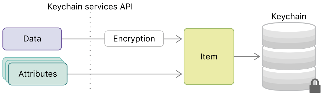 암호화하려는 데이터 뿐만 아니라 암호화된 데이터를 검색할 수 있도록 Attributes를 붙여서 패키징한 것이 KeyChain Item임.
