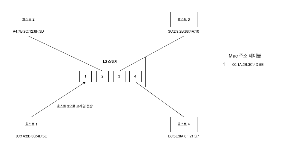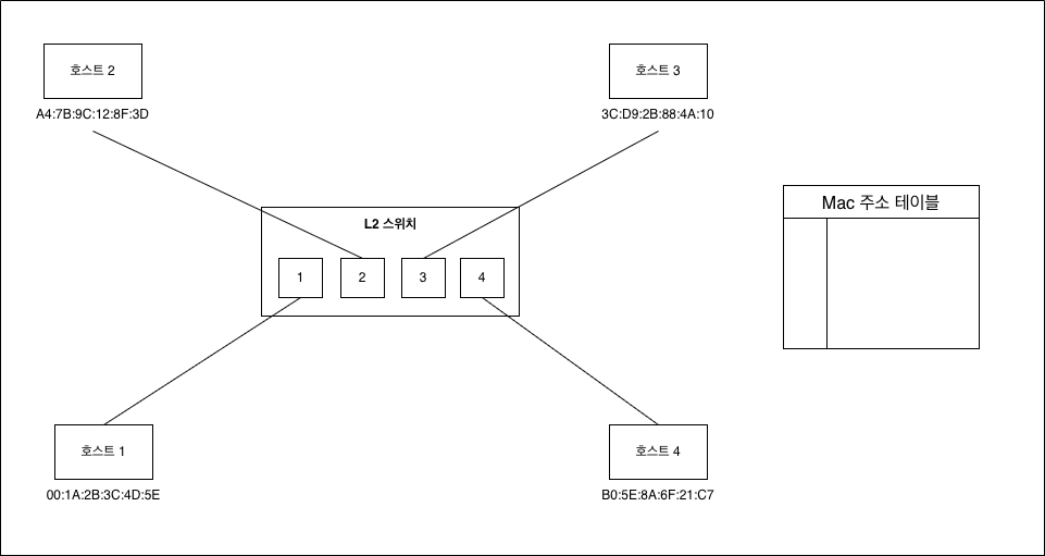 위 사진처럼 하나의 L2 스위치에 4개의 호스트가 연결되어 있다고 가정하고 설명하겠음.