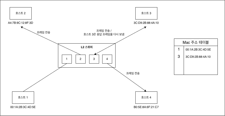 응답 프레임을 받은 스위치는 해당 프레임의 송신지 주소를 확인한 후 MAC 주소 테이블에 저장함.