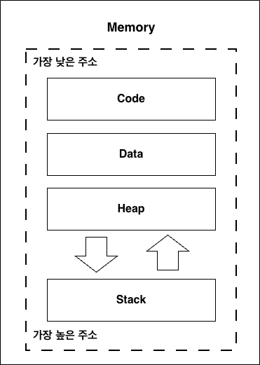 Heap은 낮은 주소에서 높은 주소 방향으로, Stack은 높은 주소에서 낮은 주소 방향으로 저장됨.