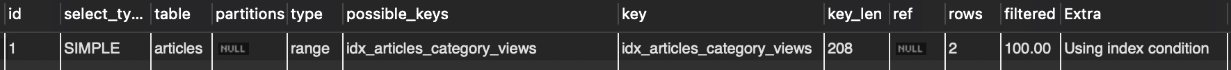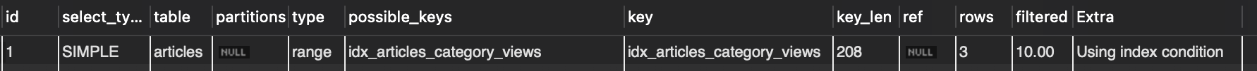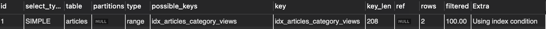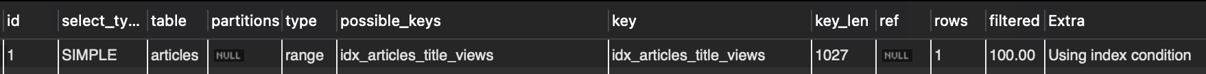 idx_articles_category_views인덱스를 타지 못하고 풀 테이블 스캔이 일어난 것을 확인할 수 있음.- 생성한 인덱스는