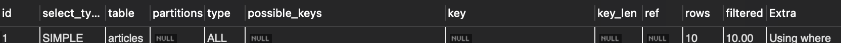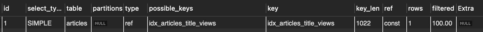 EXPLAIN SELECT * FROM articles WHERE views = 1100;