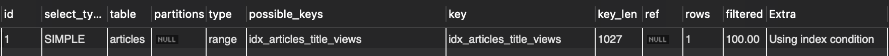 articles테이블에title,views순서로 복합 인덱스를 만들었다고 가정함.- 인덱스는 내부적으로