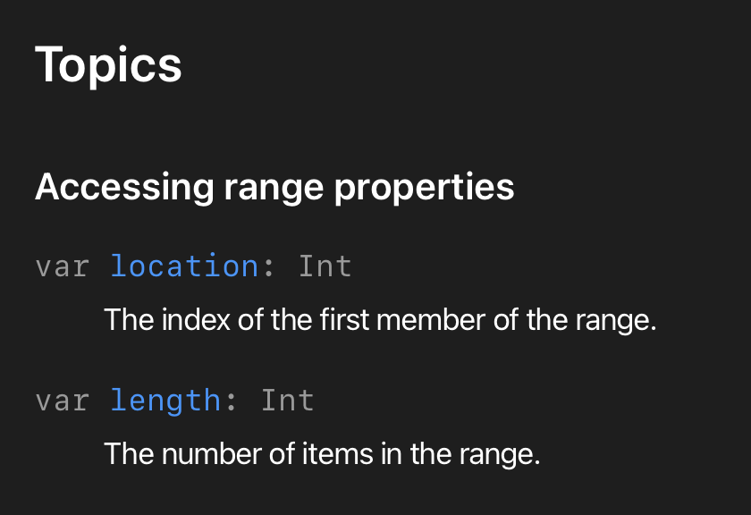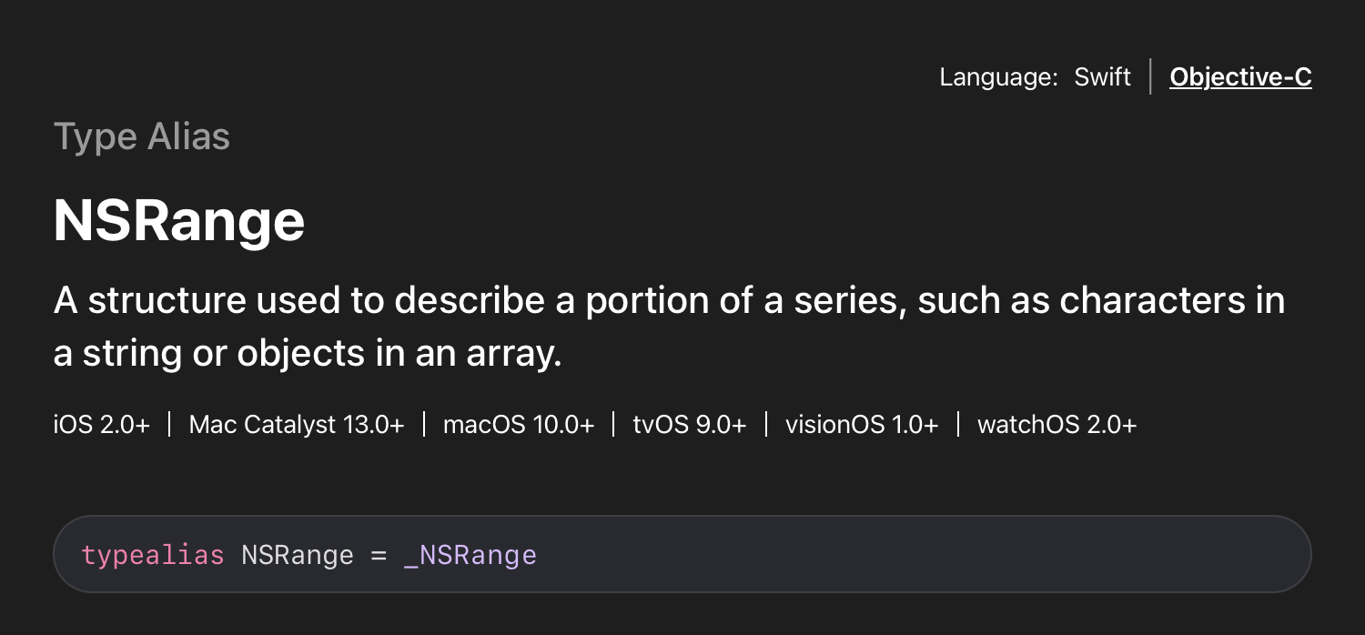 NSRange는 문자열이나 배열처럼 연속된 데이터에서 특정 구간을 표현할 때 쓰이는 구조체임.