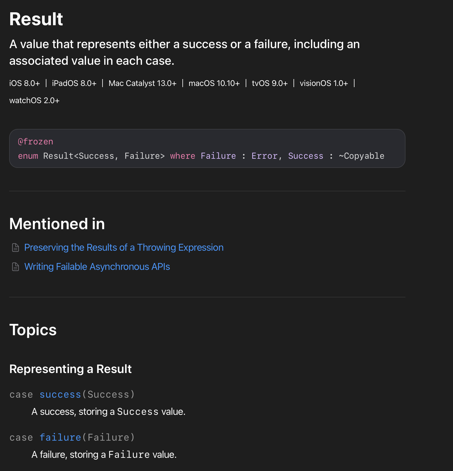 기존 Error를 던지는 코드들에는 throws와 do-catch 문을 통해 예외를 처리해줘야하기 때문에 번거로운 경우가 많았지만, Result 타입을 통해 이 문제를 해결 가능함.