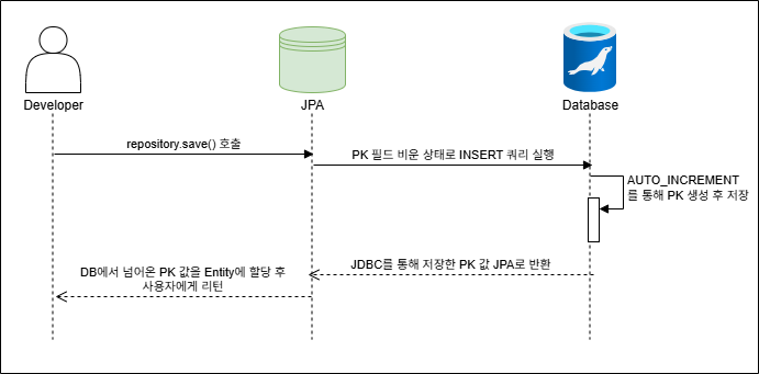 AUTO_INCREMENT처리 되어 PK 생성 후 데이터INSERT JDBC를 통해 저장된 PK 값 JPA로 반환- DB에서 넘어온 PK 값을