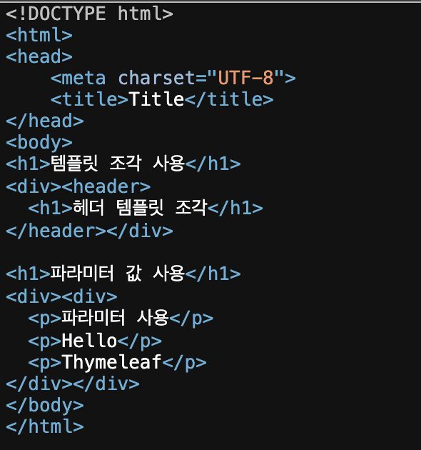 위 코드와 같이 th:insert 속성을 사용한 후 ~{} 문법을 사용해서 사용할 템플릿 조각과 파라미터 값을 설정할 수 있다.