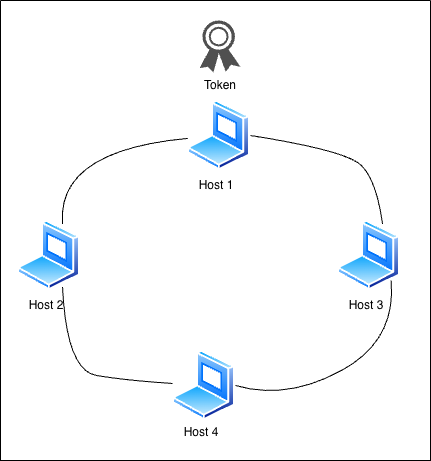 위 이미지에서는 Host 1이 토큰을 가지고 있기 때문에, Host 1만 메시지 송신이 가능하며, Host 2가 메시지를 보내고 싶어도 토큰을 받기 전까진 메시지를 송신할 수 없음.