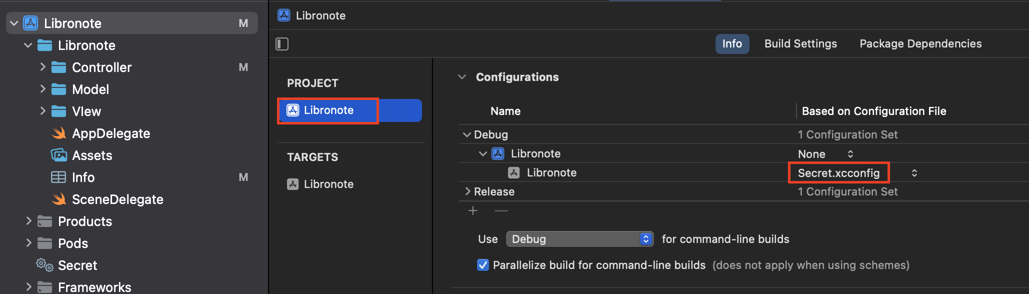아래와 같이 Project Setting에서 xcconfig 파일을 설정해줌.